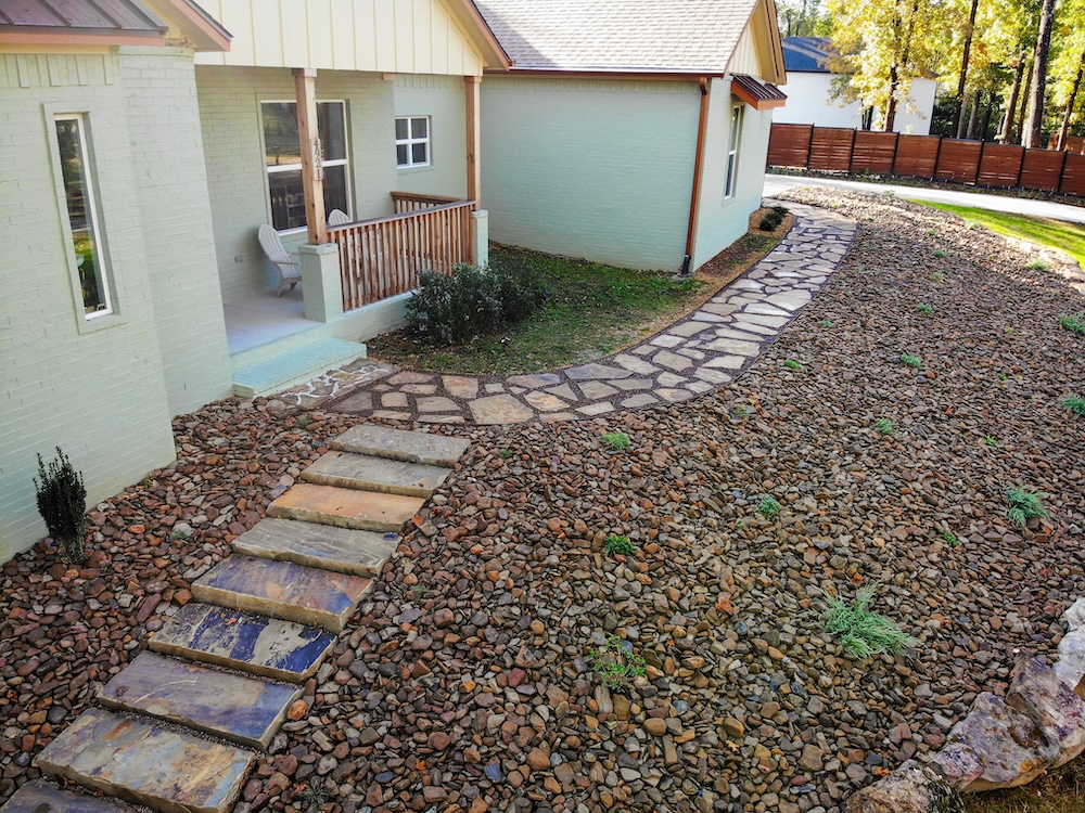 - Install 2" flagstone stepping stones with chocolate pea gravel surrounding stones