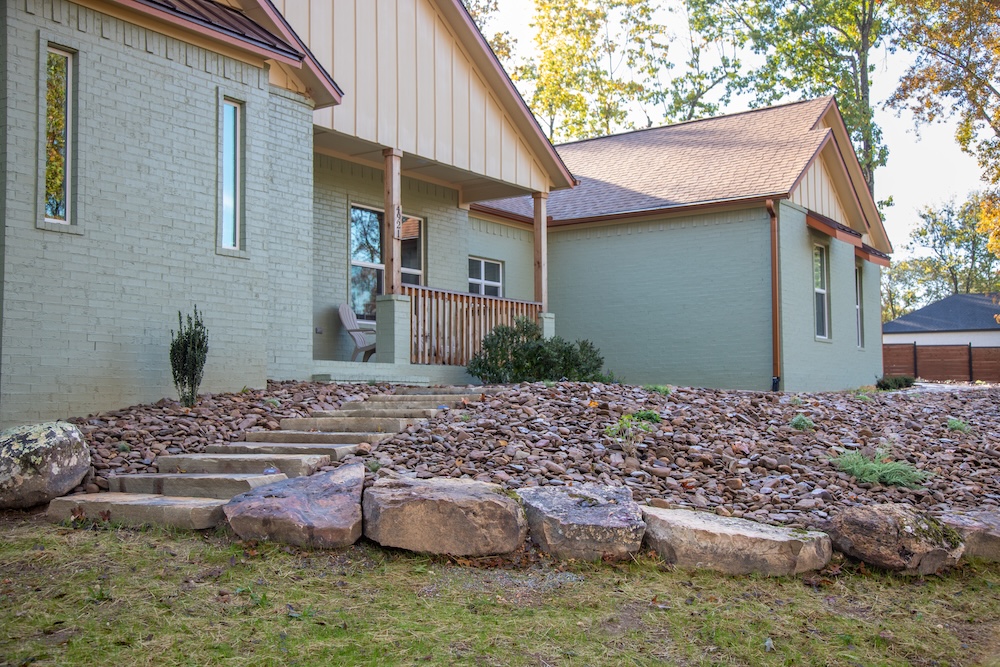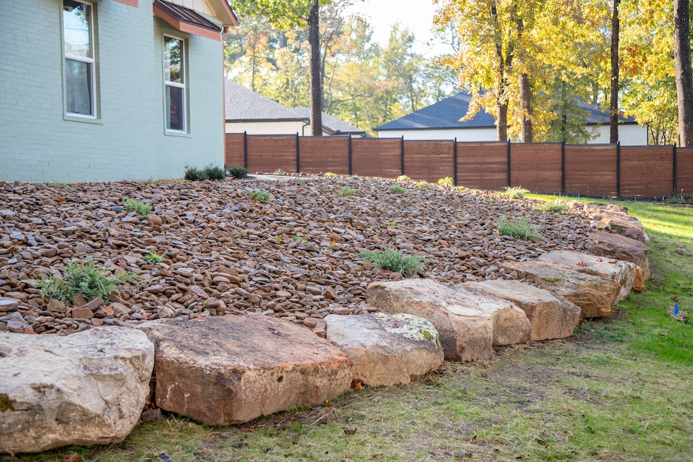 - Installed landscape fabric, backfilled with topsoil, planted new vegetation, and covered hillside with oversized chocolate river rock
