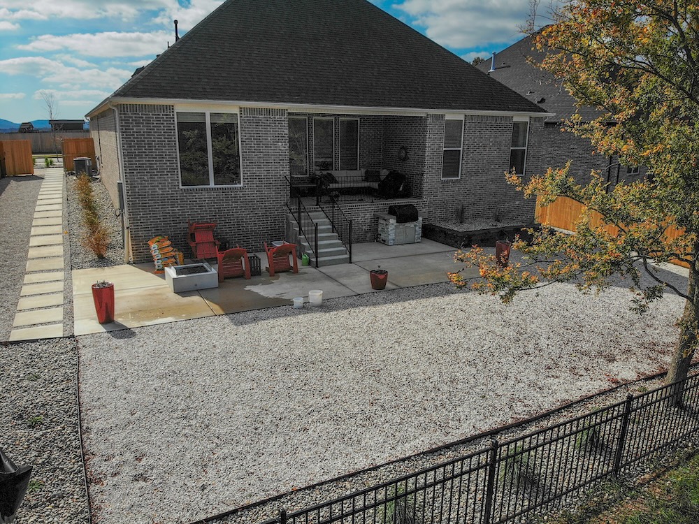 This project transformed the backyard into a functional, low-maintenance outdoor living space. We prepped the site and installed artificial turf, added new gutter downspouts for improved drainage, and poured a broom-finish concrete patio around the fire pit, grill area, and new steps with stair railings. The upgrade also included a new 20′ x 2.5′ retaining wall, river rock beds with metal edging, crushed limestone walkways, fresh topsoil with new plantings, and a 4′ black ornamental fence. To complete the space, we installed a Techo-Bloc Sculptura square fire pit and a custom grill island with natural gas hookup and built-in trash can—perfect for entertaining year-round.