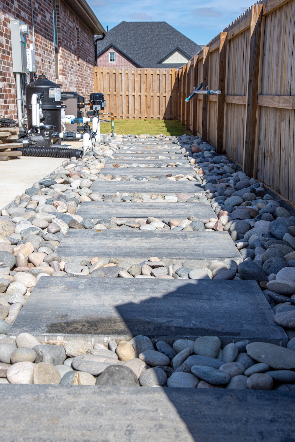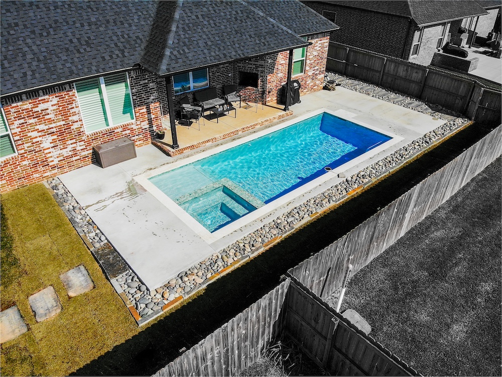 - Installed gray chop stone edging and mesa stone around perimeter of pool