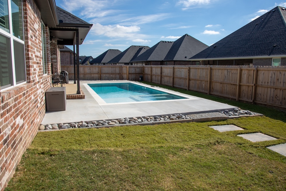 This project restored and enhanced both the front and backyard following pool and utility work. We regraded damaged areas to ensure proper drainage, sand-leveled the gas line trench, and installed fresh topsoil with Bermuda sod for a clean, even finish. Around the pool, we added gray chop stone edging with mesa stone for definition, then completed the space with gray pavers and a custom gray cut-stone step—bringing everything together with a polished, cohesive look.