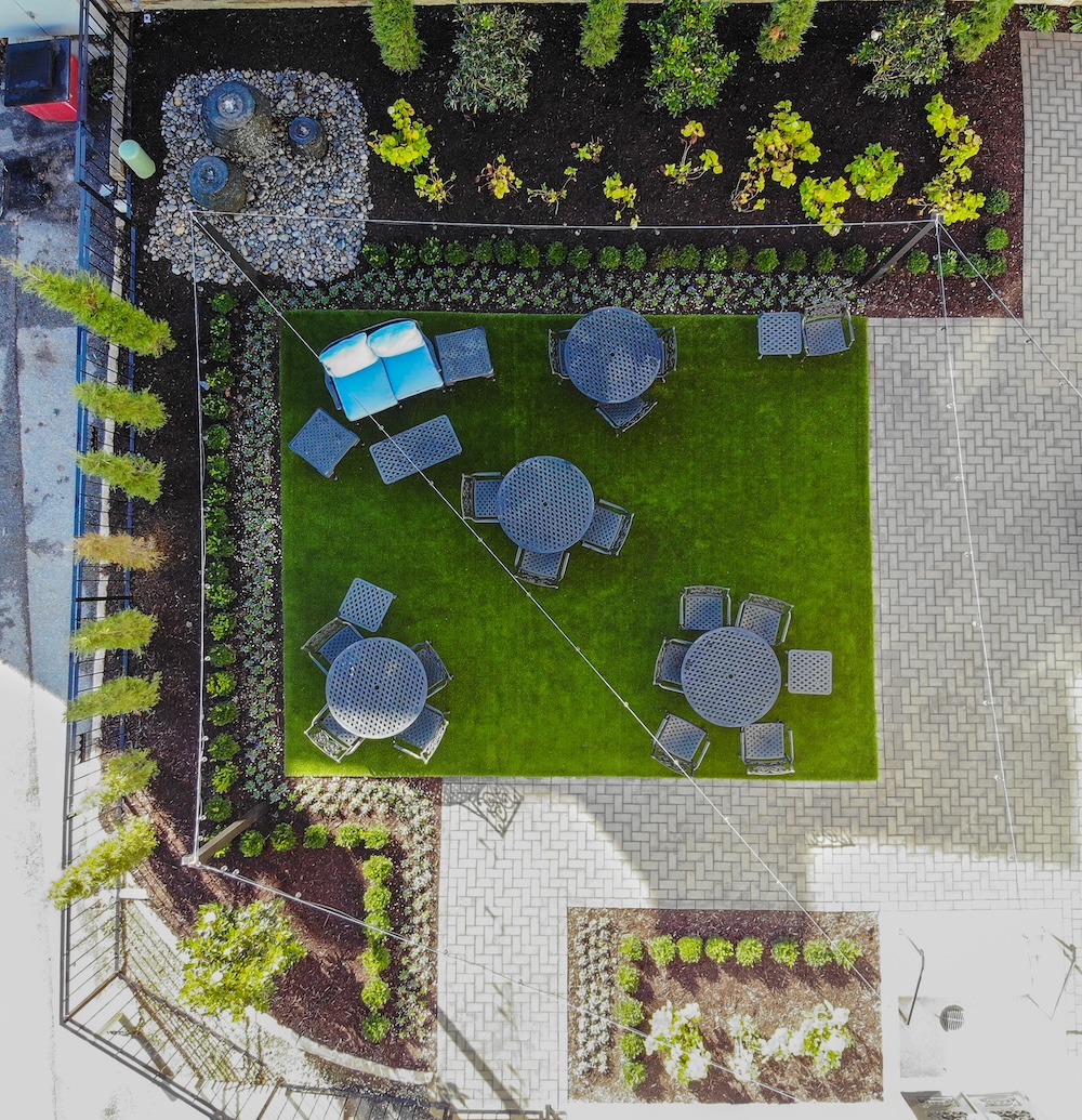 This project completely reimagined the outdoor space from the ground up. We removed existing pathways, shrubs, and a central tree, then rebuilt the area with Belgard Aqua-Roc charcoal permeable pavers for improved drainage and durability. A large Bermuda artificial turf area was installed with full base prep, antimicrobial infill, and clean edging, while new flowerbeds were built with fresh topsoil, brown mulch, and metal edging. Behind the scenes, we installed a comprehensive drainage system with storm chambers and road tie-ins, along with a brand-new irrigation system to support all beds and planters. The project was finished with a new Belgard Melville retaining wall, green velvet boxwoods for added privacy, and a custom water feature featuring three stacked urns—bringing function, privacy, and visual impact together in one cohesive design.